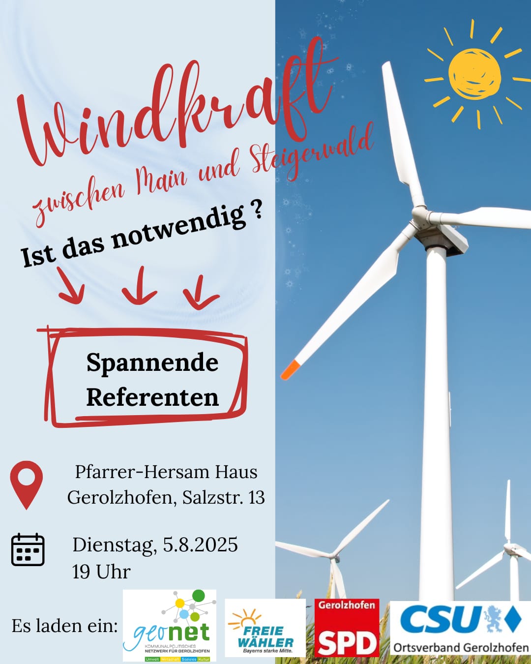 Am 05.08.2025 fand im Pfarrer-Hersam-Haus eine gemeinsame Informationsveranstaltung von CSU, SPD, Freien Wählern und geo-net zur Windkraft in der Region statt. Die Initiative ging von geo-net aus. Etwa 150 Personen nahmen an der Veranstaltung teil.